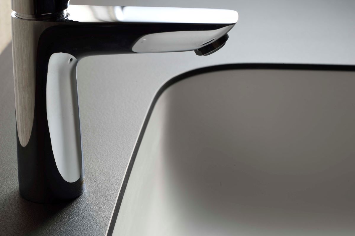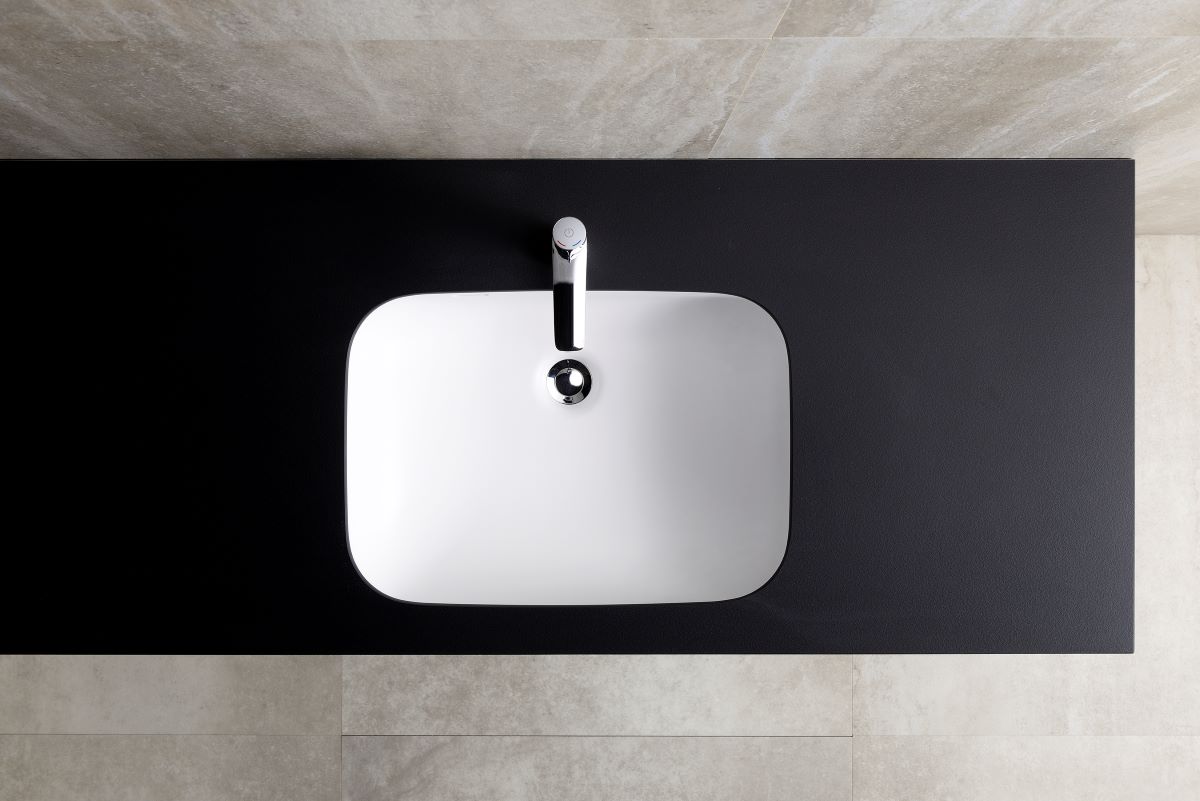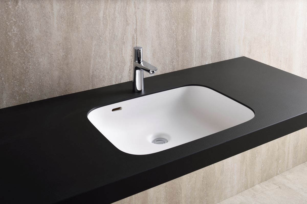 Chậu rửa mặt cao cấp UR3854 của thương hiệu Yoshimoto Global có bề mặt trắng mờ hiện đại với các góc bo mềm mại. Chậu có thể được gắn âm liền khối không thấy mối nối, không sử dụng keo silicon với mặt bàn đá Ultra Surface cao cấp hoặc mặt bàn đá cẩm thạch nhân tạo BMC, tăng thêm tính thẩm mỹ và vệ sinh.